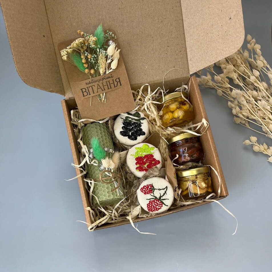 Подарунковий набір 38501,00 ₴ Склад набору: – свічка з вощини 10*3,5 см з декором S – варення карпатське, 42 мл, 3 шт. – кеш’ю з медом, 30 мл – фундук з медом, 30 мл – мигдаль з медом, 30 мл – крафтова листівка із сухоцвітами Подарунковий набір 38 кількість Додати в кошик Категорії: До дня Вчителя, Подарункові набори Позначок: ексклюзивний подарунок, медовий набір, набір для подарунка на свято, оригінальний подарунок, подарунковий набір для жінок, подарунковий набір ручної роботи, Подарунок, подарунок вчителю, подарунок для дівчини, подарунок на будь-яке свято, подарунок на день народження, подарунок на Миколая, подарунок на Новий рік, подарунок на Різдво, святковий набір, унікальний подарунок ручної роботи, хендмейд подарунок Схожі товари До дня Вчителя/Подарункові набориПодарунковий набір 17 566,00 ₴ Додати в кошик До дня Вчителя/Подарункові набориПодарунковий набір 19 291,00 ₴ Додати в кошик До дня Вчителя/Подарункові набориПодарунковий набір 14 416,00 ₴ Додати в кошик