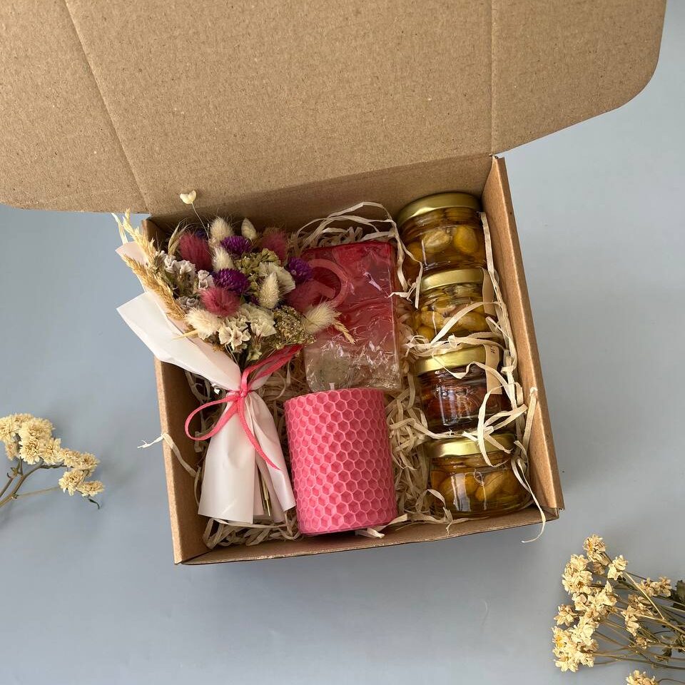 Подарунковий набір 48410,00 ₴ Склад набору: – свічка з вощина 6*5 см – букетик сухоцвітів – мило ручної роботи, 60 г – мигдалю, фундука, кешʼю з медом, 30 мл кожна баночка Подарунковий набір 48 кількість Додати в кошик Категорії: До дня Вчителя, Подарункові набори Позначок: ексклюзивний подарунок, медовий набір, набір для подарунка на свято, оригінальний подарунок, подарунковий набір для жінок, подарунковий набір ручної роботи, Подарунок, подарунок вчителю, подарунок для дівчини, подарунок на будь-яке свято, подарунок на день народження, подарунок на Миколая, подарунок на Новий рік, подарунок на Різдво, святковий набір, унікальний подарунок ручної роботи, хендмейд подарунок Схожі товари До дня Вчителя/Подарункові набориПодарунковий набір 17 566,00 ₴ Додати в кошик До дня Вчителя/Подарункові набориПодарунковий набір 2 394,00 ₴ Додати в кошик До дня Вчителя/Подарункові набориПодарунковий набір 23 323,00 ₴ Додати в кошик