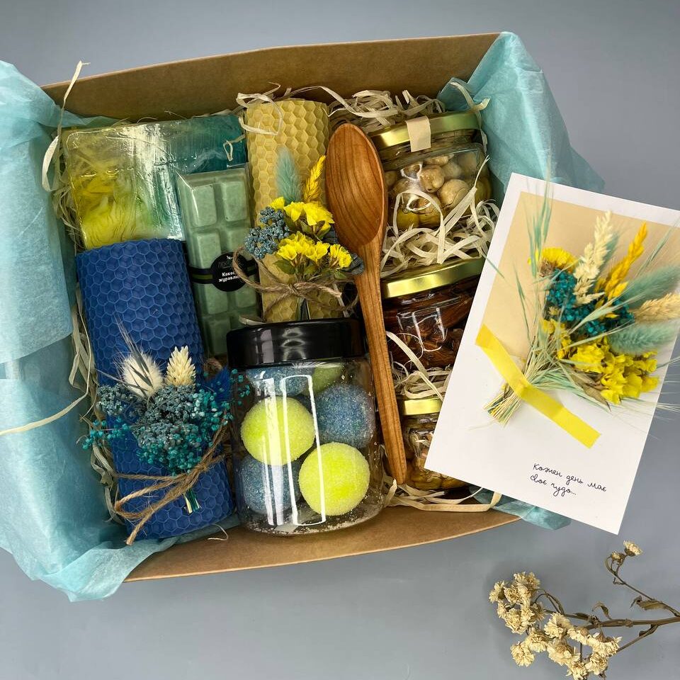 Подарунковий набір 55992,00 ₴ Склад набору: – мило ручної роботи – свічка 13*5 см з декором Л – свічка 6*3,5 см з декором М – мило-скраб – деревʼяна ложечка -шоколадка – 3 баночки горішків з медом, 100 мл (кешʼю, фундук, мигдаль) – листівка із сухоцвітами велика Подарунковий набір 55 кількість Додати в кошик Категорії: До дня Вчителя, Подарункові набори Позначок: ексклюзивний подарунок, медовий набір, набір для подарунка на свято, оригінальний подарунок, подарунковий набір для жінок, подарунковий набір ручної роботи, Подарунок, подарунок вчителю, подарунок для дівчини, подарунок на будь-яке свято, подарунок на день народження, подарунок на Миколая, подарунок на Новий рік, подарунок на Різдво, святковий набір, унікальний подарунок ручної роботи, хендмейд подарунок Схожі товари До дня Вчителя/Подарункові набориПодарунковий набір 15 505,00 ₴ Додати в кошик До дня Вчителя/Подарункові набориПодарунковий набір 7 147,00 ₴ Додати в кошик До дня Вчителя/Подарункові набориПодарунковий набір 30 585,00 ₴ Додати в кошик